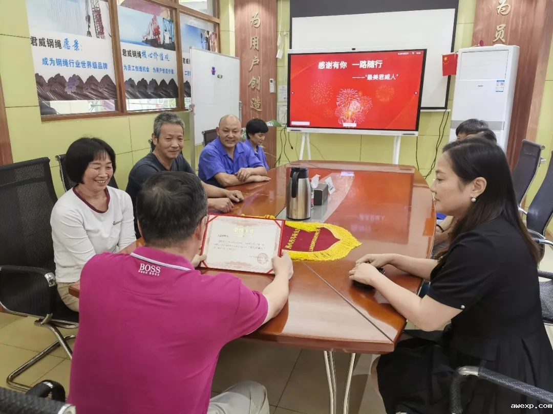 尽管现在朱阿姨要光荣退休了,公司却始终对其保持着一份敬意和关怀。董事长亲自为朱志芳颁发了"最美君威人"荣誉证书,以及带有充分感激和祝福的锦旗。颁发过程中,董事长说:"感谢多年来你对君威的贡献,在岗位上一直任劳任怨,此次的离开希望你日后的生活中,好好调理身体,开心的过好每一天!"言语中充分对朱志芳的贡献给予了肯定。
