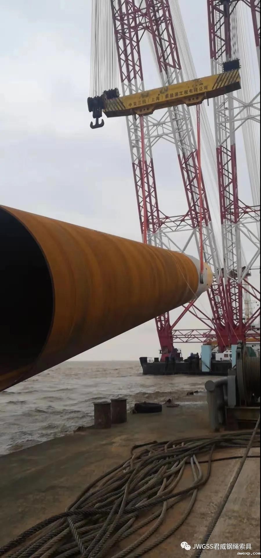 开创先河!君威高分子吊索成功应用于海上风电管桩吊装,12月8日下午13:00,国内首台6.45MW风机单桩在中交三航局奉贤海上风电项目基地..